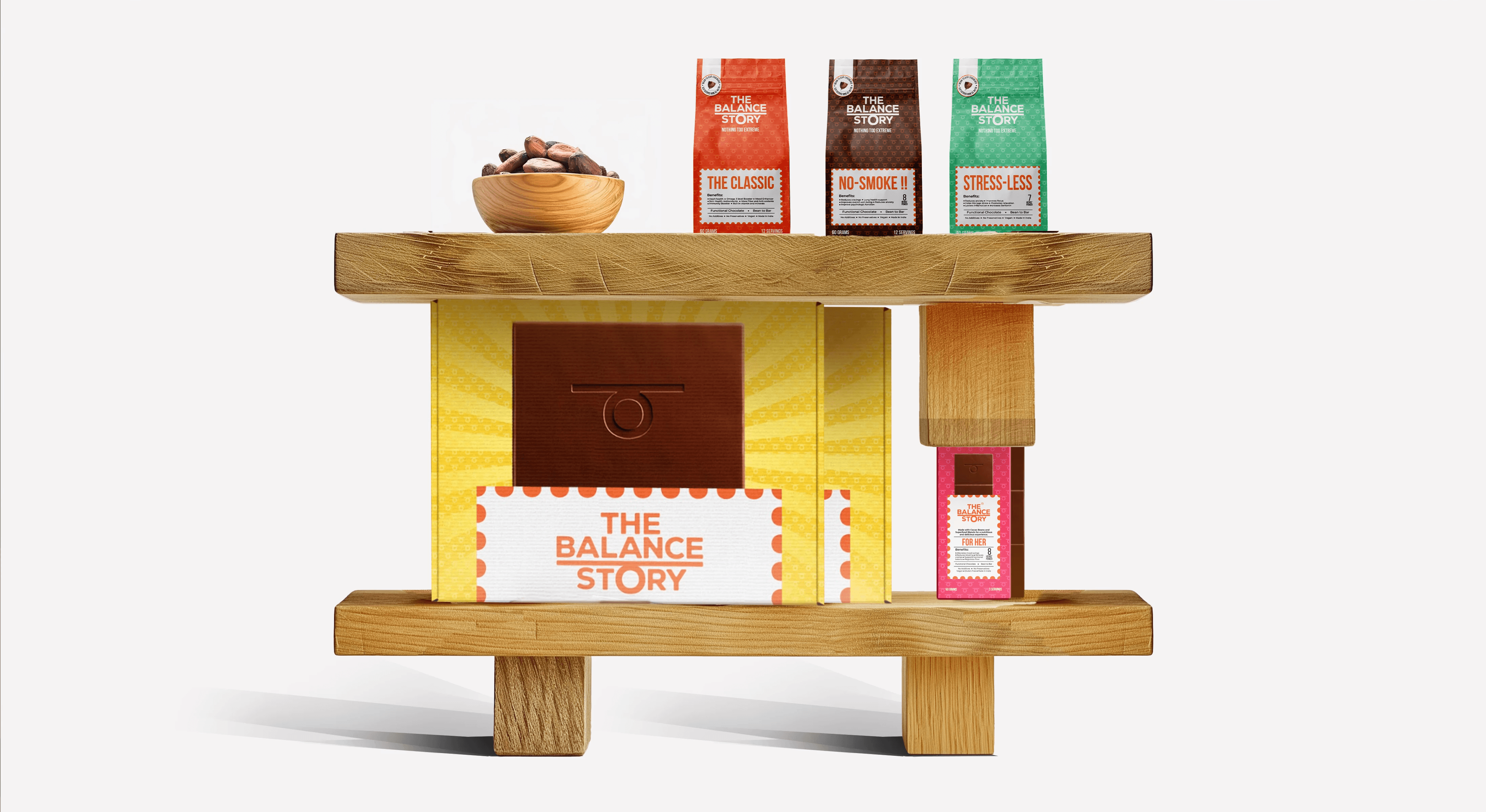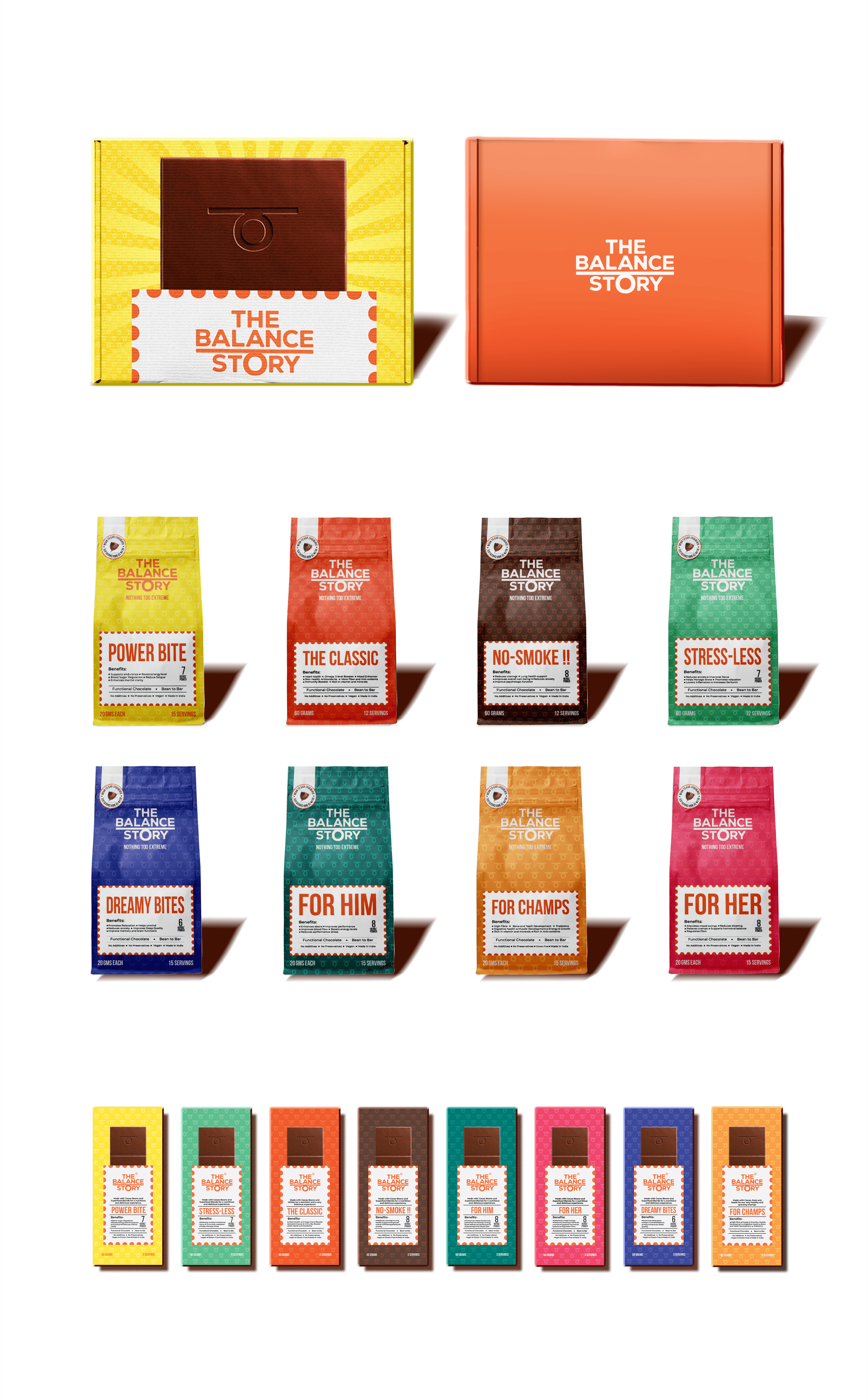 For The Balance Story, the challenge was to design packaging that clearly differentiated each herb-infused chocolate variant while conveying their functional benefits and aligning with the brand's ethos of "Nothing too extreme."
